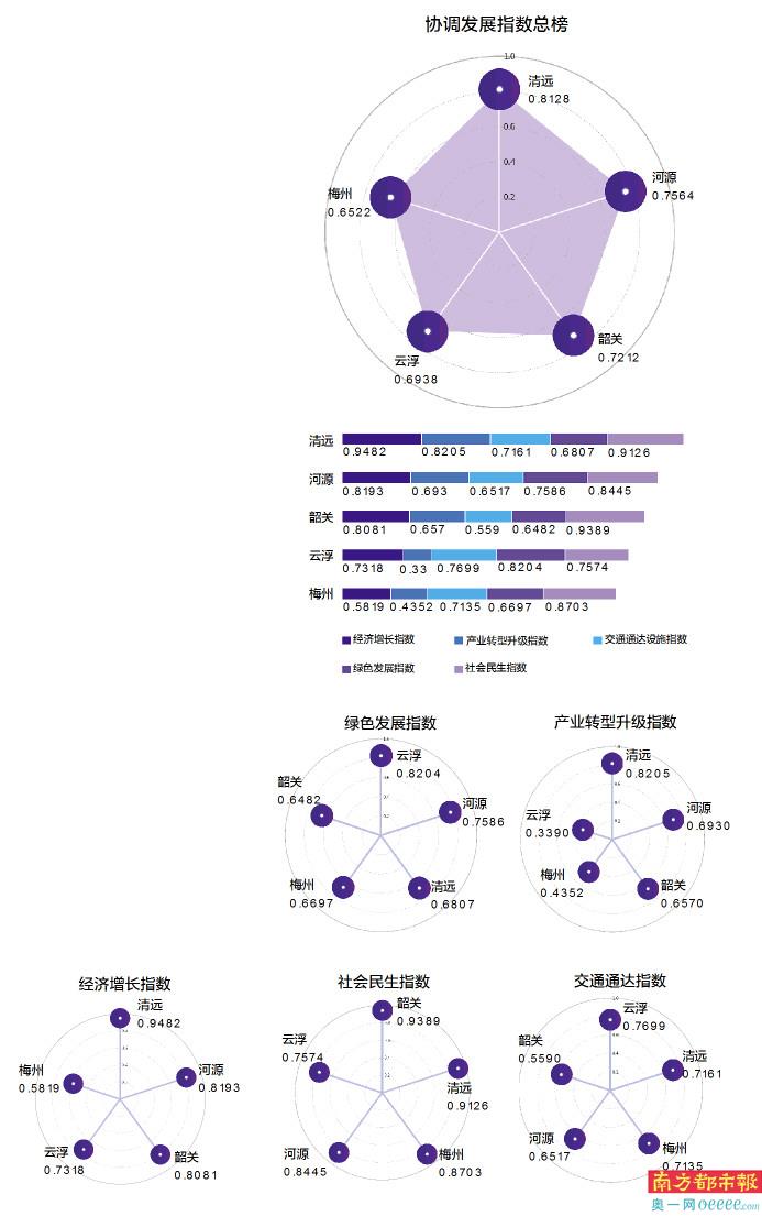 北部生态发展区协调发展指数总榜显示,清远以绝对优势蝉联冠军,在经济增长指数、产业转型升级指数两项分榜单中排名第一,在交通通达指数和民生指数中排名第二;河源超越韶关成为亚军,在经济增长指数、产业转型升级指数、绿色发展指数中均排名第二。