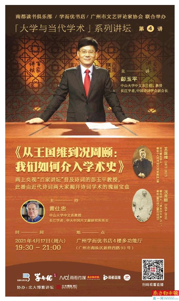 两上央视“百家讲坛”普及古典诗词的中山大学中文系主任彭玉平教授,4月17日晚在广州学而优书店开讲诗词,主讲的题目是《从王国维到况周颐:我们如何介入学术史》,他将结合自己的研究,由近代词学两大家入手来揭示晚清词学的一段脉络。