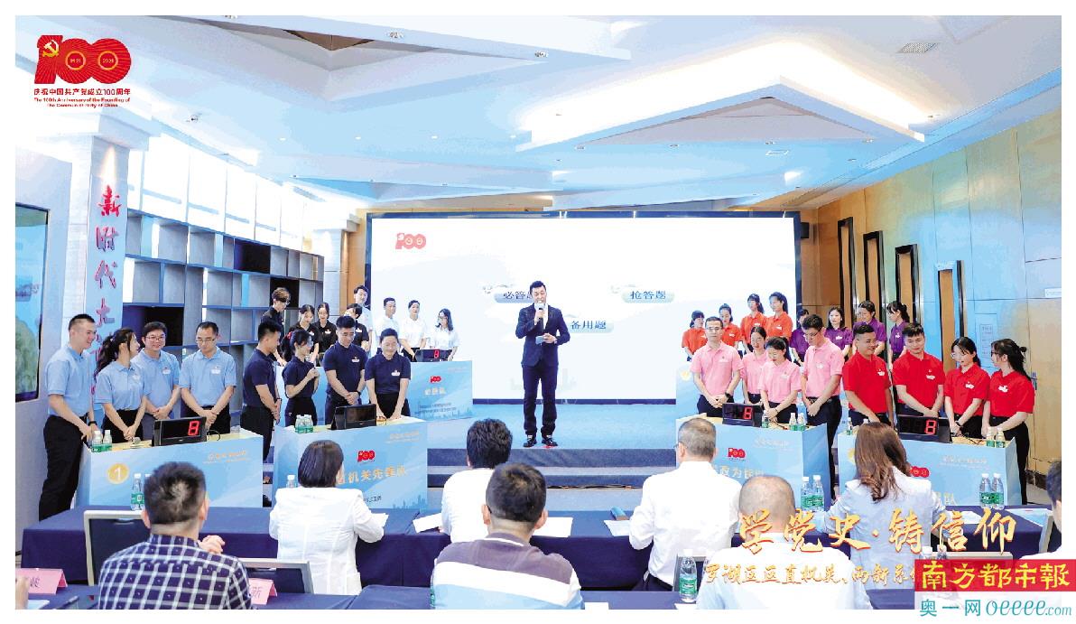 5月12日,由区委组织部、区两新组织党工委、区直机关工委主办,区民政局、区社会组织党委承办的罗湖区区直机关、两新系统“学党史·铸信仰”党史知识竞赛在宝能党群服务中心举行。来自区直机关、非公组织、社会组织的8支队伍围绕党史、罗湖改革开放史的知识,进行必答、抢答、支部党建风采展示等进行抢答,以学助赛、以赛验学,掀起党史知识比学赶超热潮。