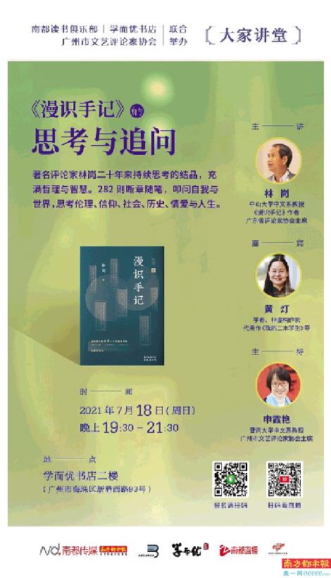 南都讯 记者刘晨 今日晚7时30分,著名文学批评家、中山大学中文系教授林岗将在广州学而优书店(新港西路店)出席“《漫识手记》的思考与追问”大家讲堂活动,“大家讲堂”是由南都读书俱乐部、学而优书店和广州文艺评论家协会联合举办的文化活动,已举办多期。在本次活动中,林岗教授将与作家黄灯、文学评论家申霞艳一起与读者分享有关《漫识手记》的写作与思考。届时,南都直播将现场直播全程活动。