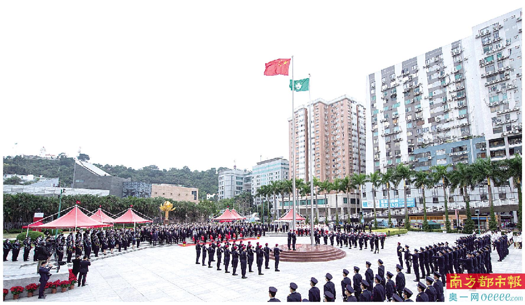 12月20日,澳门特区政府举行升旗仪式和酒会等活动,庆祝澳门回归祖国22周年。正在澳门进行交流活动的内地奥运健儿代表团参加了升旗仪式。