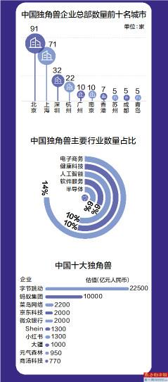 榜单显示,中国以301家排名第二,比去年增加74家。南都记者查询榜单发现,中国有8家独角兽企业估值超千亿,其中3家进入榜单前十名,分别为字节跳动、蚂蚁集团和菜鸟网络。榜单显示,国内独角兽企业数量最多的城市为北京,多达91家;接下来分别是上海、深圳,数量分别为71家和32家。从行业来看,中国独角兽从事电子商务、医疗健康和人工智能行业的较多,占中国独角兽企业总数的三分之一。另外,中国独角兽企业一个很大的特点,是很多独角兽企业由母公司孵化而来。50家全球独角兽企业由母公司孵化而来,其中49家来自中国。而阿里巴巴孵化了最多的独角兽企业,有5家。
