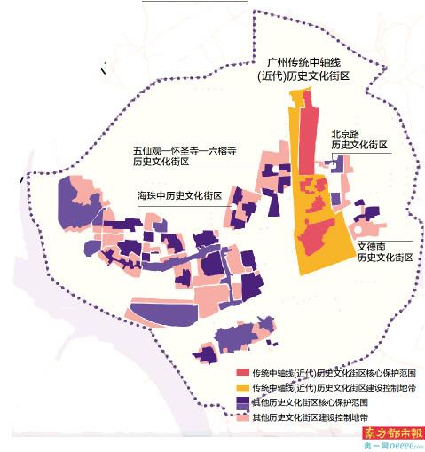 从规划图可见,传统中轴线(近代)历史文化街区有四大街区:北京路历史文化街区、文德南历史文化街区、五仙观-怀圣寺-六榕寺历史文化街区和海珠中历史文化街区。