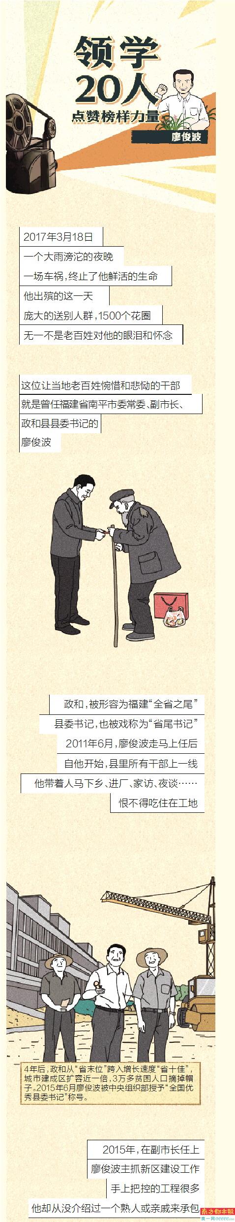 2017年3月18日,一个大雨滂沱的夜晚,福建省南平市委常委、副市长廖俊波在赶往武夷新区主持召开会议途中不幸遭遇车祸,因公殉职,年仅48岁。