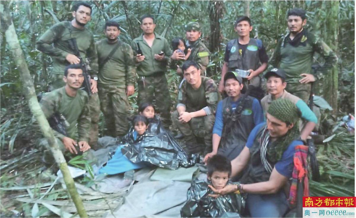 哥伦比亚军方9日通过社交媒体推特发布一群士兵和志愿者与4名获救儿童的合影,孩子们裹着保暖毯,一名士兵将一个瓶子放在最小的孩子嘴边。